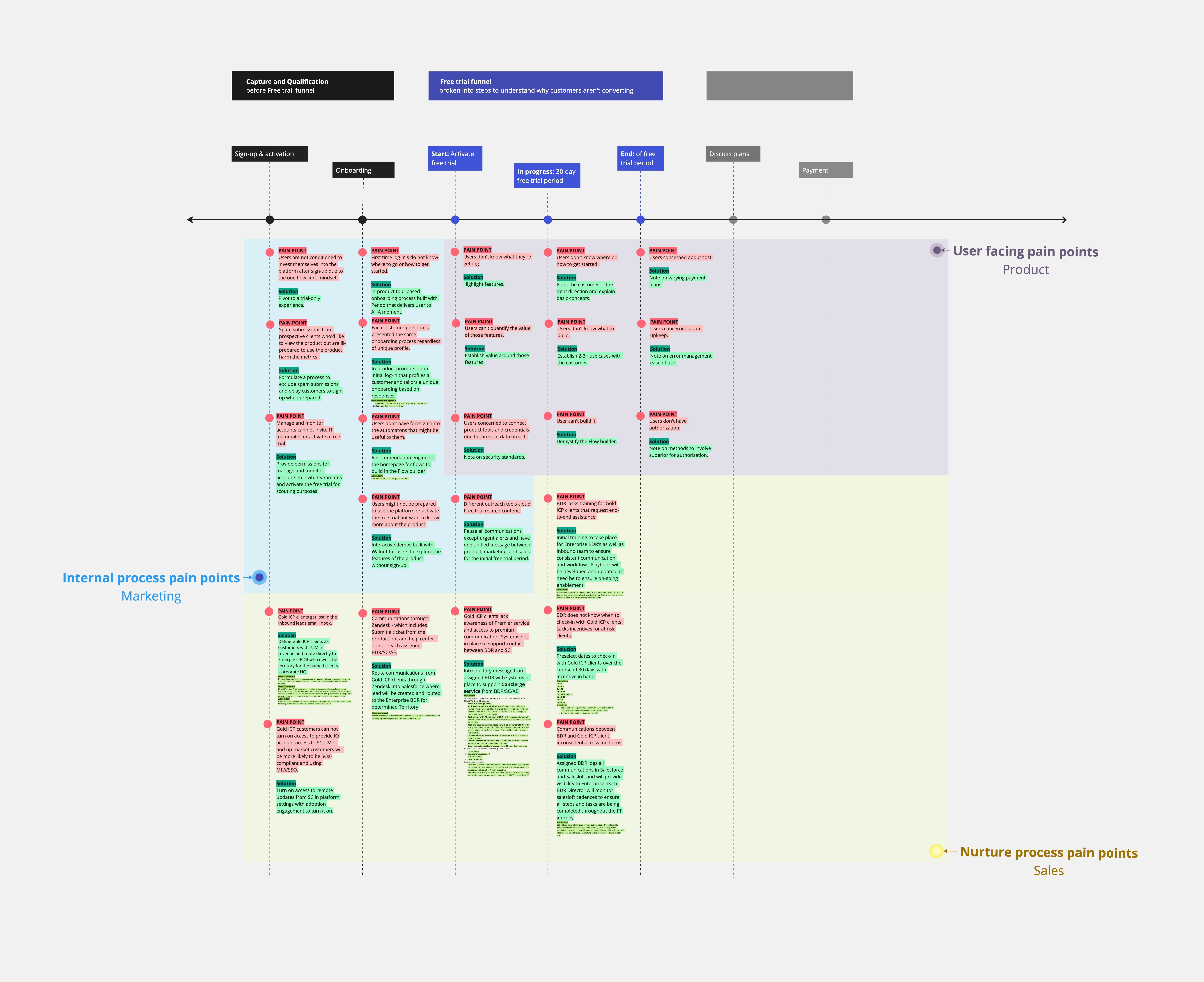 To identify the reasons for low conversion rates, I broke down the free trial funnel into individual stages and identified the pain points, and solutions, at each step. I then further split this into 3 colors - purple for user facing pain points, blue for the marketing internal process pain points, and yellow for the sales nurture process pain points.